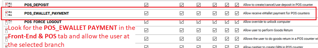 4. In the permission sub-header, expand FrontEnd & POS and enable POS_EWALLET_PAYMENT for the User in the correct Branch.