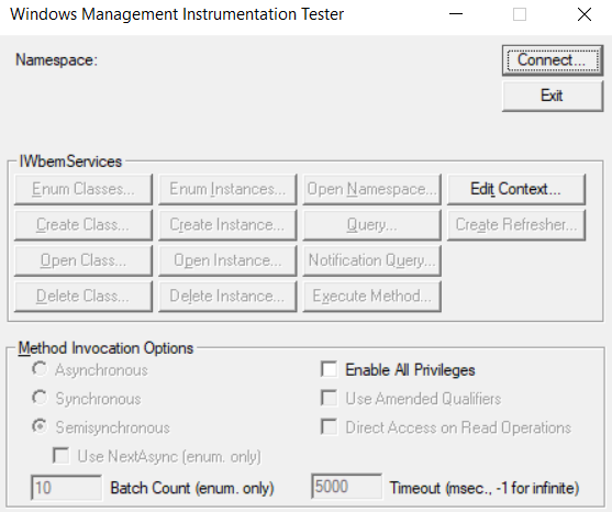 2. Launch the Command Prompt and insert the command "wbemtest". In the panel that appears, click on "Connect".